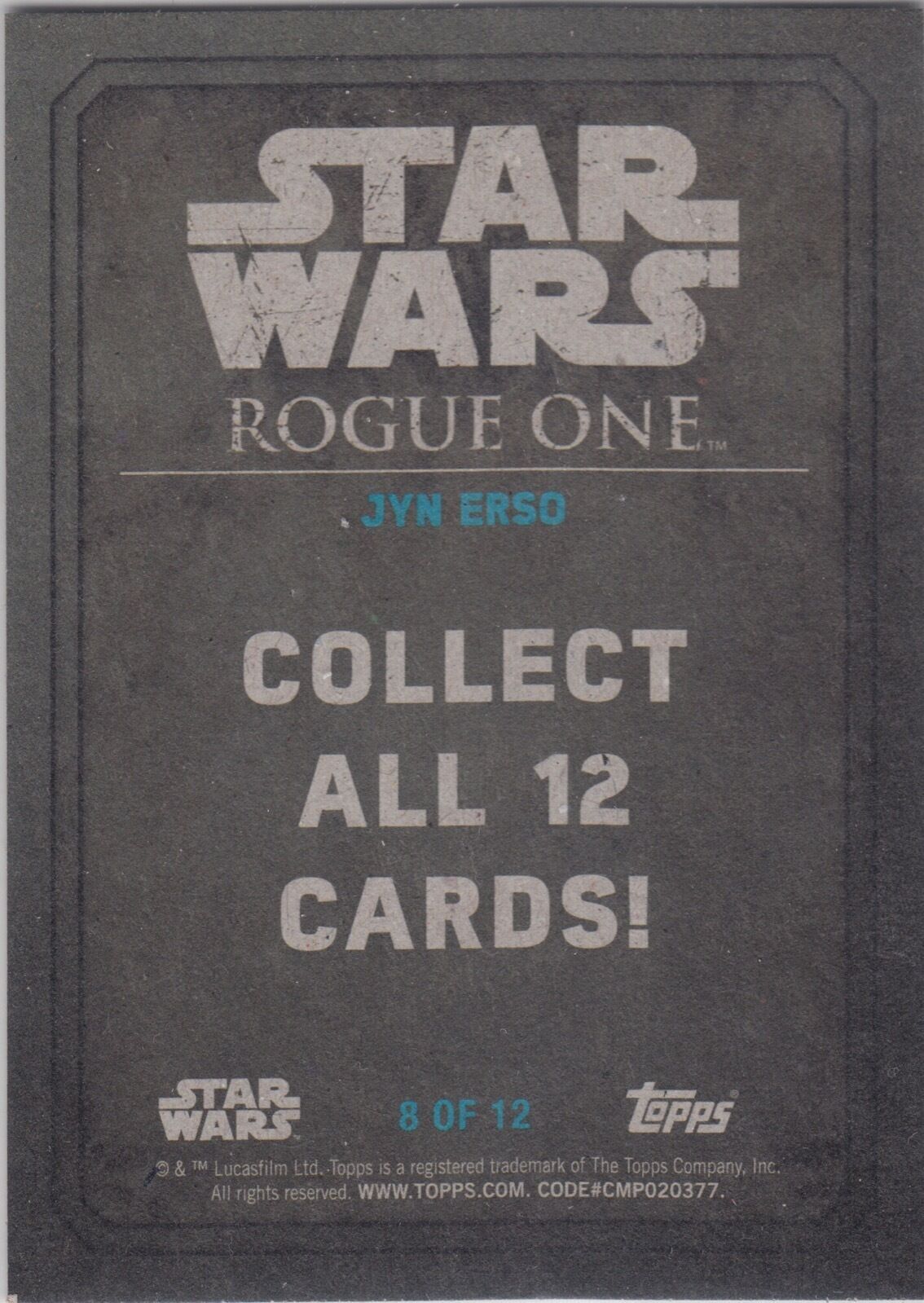 This is the single card #8 entitled JYN ERSO that formed part of the 12 card Comic Strip insert set from the Topps Star Wars Rogue One Mission Briefing trading cards.. Great looking cards.