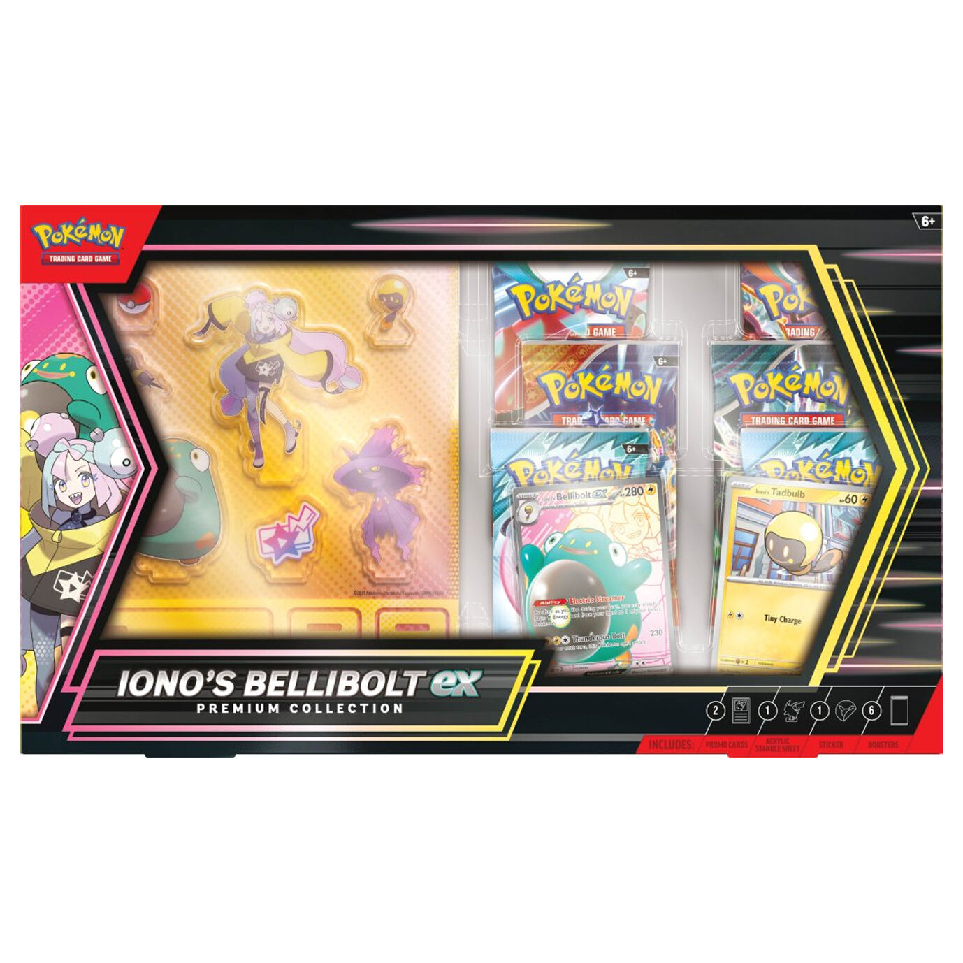 Levincia Gym Leader Iono and her partner Pokémon Bellibolt are an inseparable team full of supercharged spirit! With this collection, you can call on Iono’s Bellibolt ex and its Electric Streamer Ability to energize the rest of Iono’s Pokémon on your side. Then, get caught up in more electrifying fun with acrylic standees, a colorful photo sticker, and a handful of Pokémon TCG booster packs!