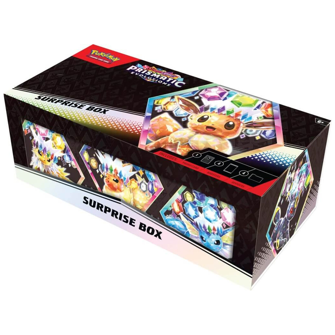 The Pokémon TCG: Scarlet & Violet—Each (x6) Prismatic Evolutions Surprise Box includes:
