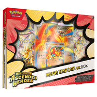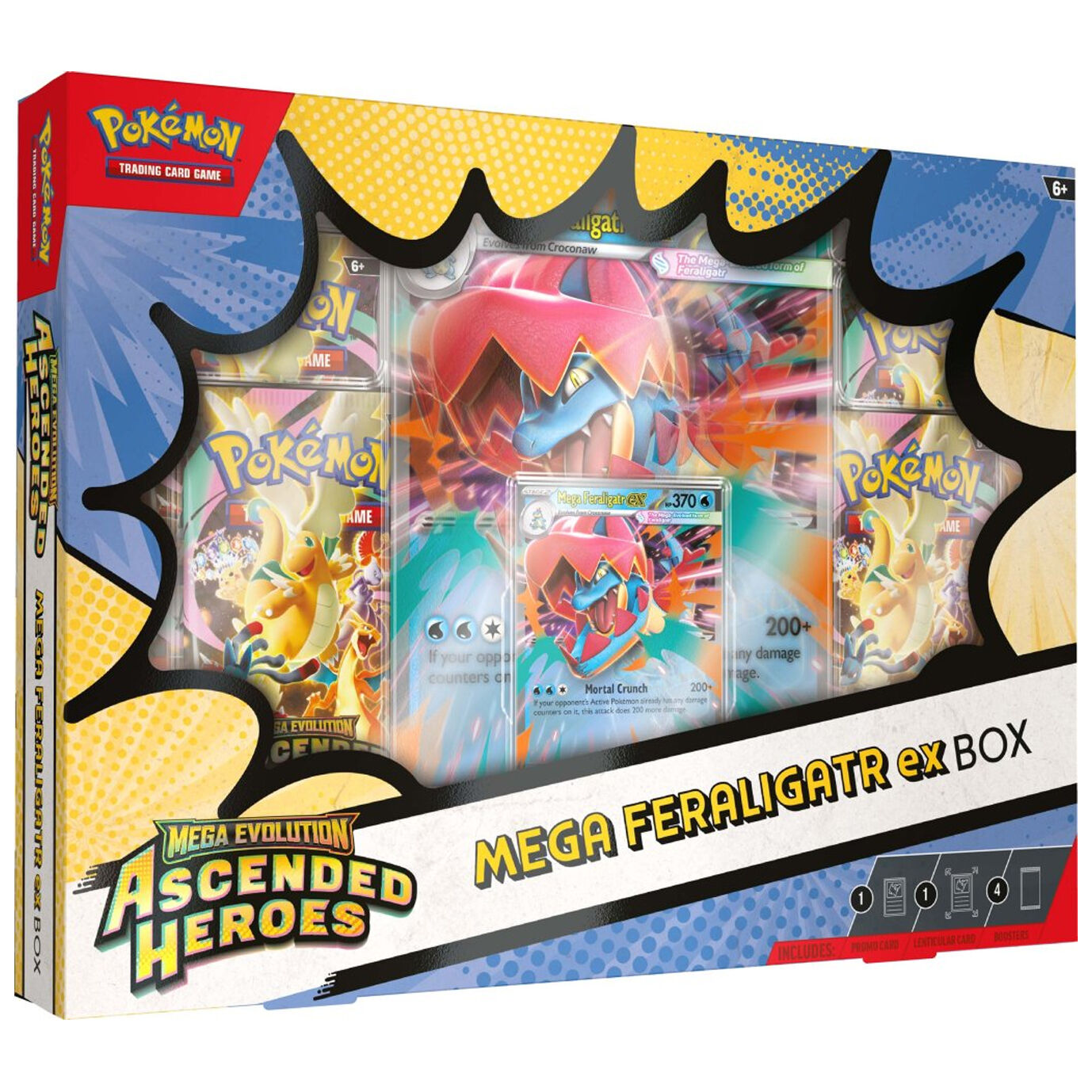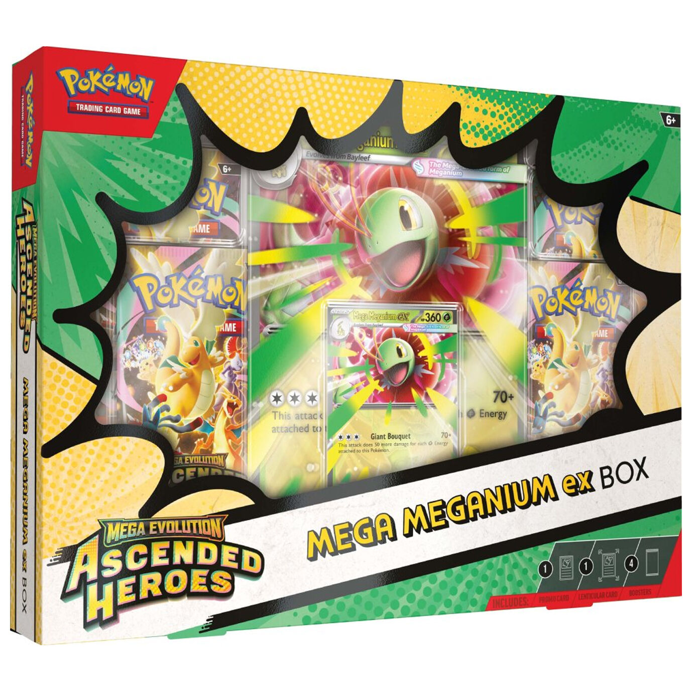 The Pokémon TCG: Mega Evolution—Ascended Heroes Mega Meganium ex Box, Mega Emboar ex Box, or Mega Feraligatr ex Box includes: