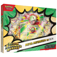 Forge a bond that takes your partner Pokémon’s strength past the limit with Mega Evolution! In this box, you’ll find Mega Meganium ex, Mega Emboar ex,or Mega Feraligatr ex as a playable foil promo card, along with an oversize lenticular card with dynamic artwork and four booster packs from the special Mega Evolution—Ascended Heroes expansion.