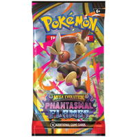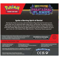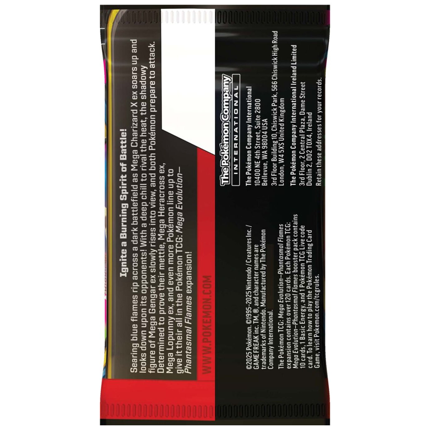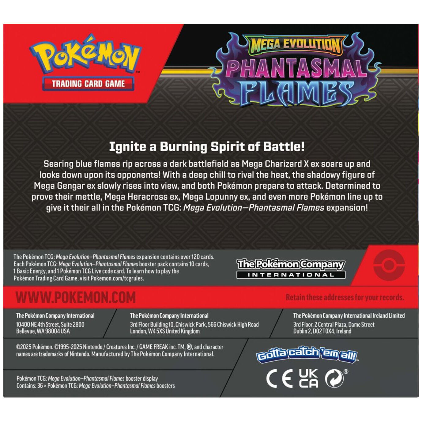 Searing blue flames rip across a dark battlefield as Mega Charizard X ex soars up and looks down upon its opponents! With a deep chill to rival the heat, the shadowy figure of Mega Gengar ex slowly rises into view, and both Pokémon prepare to attack. Determined to prove their mettle, Mega Heracross ex, Mega Lopunny ex, and even more Pokémon line up to give it their all in the Pokémon TCG: Mega Evolution— Phantasmal Flames expansion!