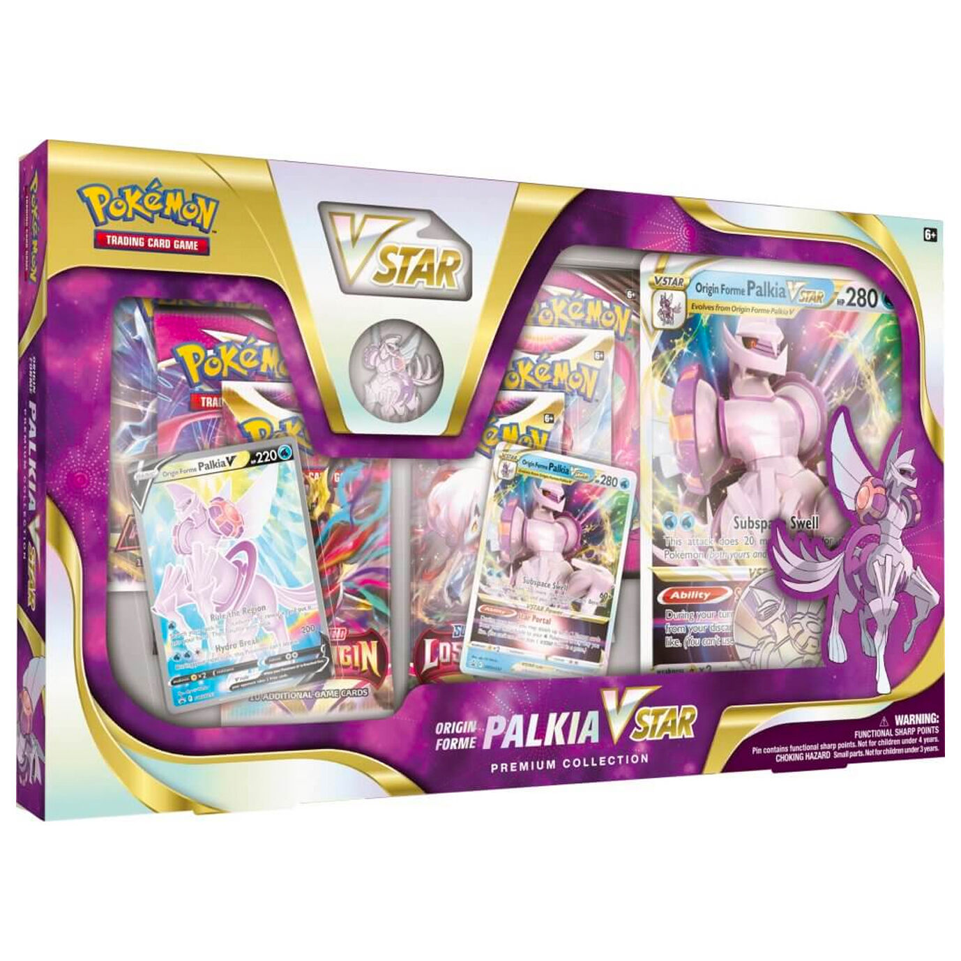 Origin Forme Palkia VSTAR soars across the sky and twists the fabric of space! Appearing here in both playable and oversize versions, each ancient Legendary Pokémon boasts a potentially game-changing VSTAR Power. To round out this deluxe collection, the star Pokémon also appears as a Pokémon V, metal pin, and shimmering coin!