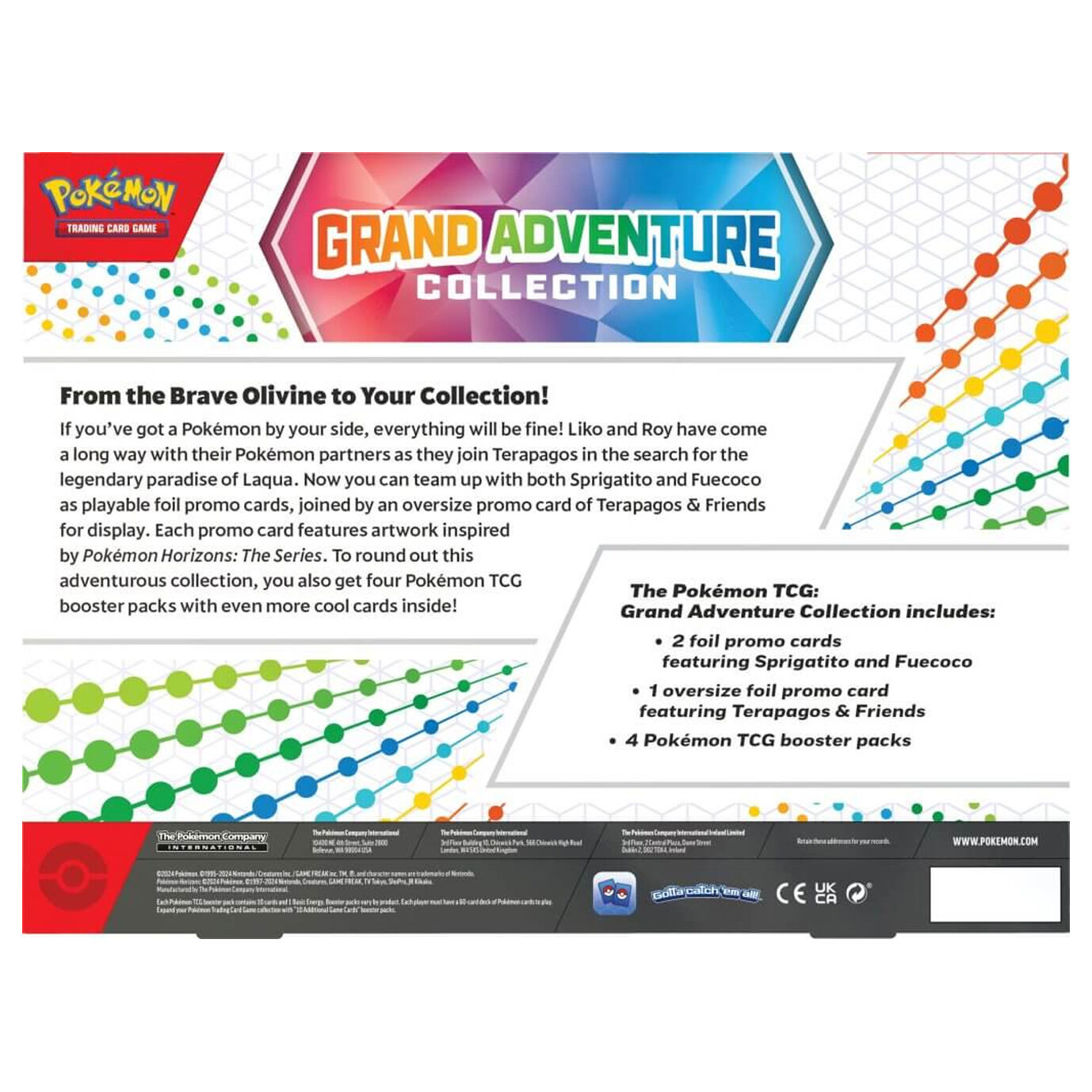 If you’ve got a Pokémon by your side, everything will be fine! Liko and Roy have come a long way with their Pokémon partners as they join Terapagos in the search for the legendary paradise of Laqua. Now you can team up with both Sprigatito and Fuecoco as playable foil promo cards, joined by an oversize promo card of Terapagos & Friends for display. Each promo card features artwork inspired by Pokémon Horizons: The Series. To round out this adventurous collection, you also get four Pokémon TCG booster packs with even more cool cards inside!